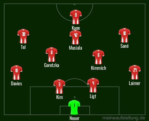 Falls Davies und Laimer spielfit sind. Wahrscheinlich wird es auch offensiv nicht so werden, eher dann wohl Müller für Tel, und Dier für de Ligt, anyway, wollte das nur mal vorschlagen: