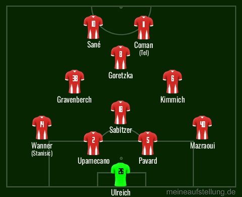 Allerdings würde ich beim Blick auf unsere jüngere Vereinsgeschichte dringend davon abraten und die bestmögliche Elf aufs Feld schicken. Im Defensivbereich sind da ja mit Ulreich, Mazraoui auf rechts, Stanisic auf links und Pavard als IV schon Experimente genug, da sollte man im MIttelfeld und im Angriff die nominell stärkste Besetzung bringen, also eher keinen Gravenberch oder Tel.