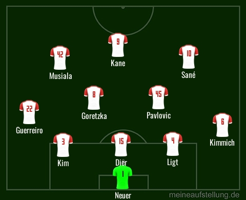 Wenn man offensiv spielen will/muss, dann braucht es eine gute Konterabsicherung, weder de Ligt noch Dier sind dafür schnell genug, eine Dreier- resp. Fünferkette brächte mehr Stabilität, ein schneller Mann wie Kim wäre da nicht verkehrt. In der Viererkette hättest du entweder Nous oder Guerreiro auf AV. Nous hat da gegen Köln nicht gerade sehr viele Argumente für seinen Einsatz vorbringen können. Da uns aber vorne Gnabry und Coman (Edit: vorher stand hier fälschlicherweise Sané, sorry) abgehen, dürfte dann schon Müller bei einem 4-2-3-1 gute Chancen für die Startelf haben. Demgegenüber fände ich die oben angezeigte Formation stärker.