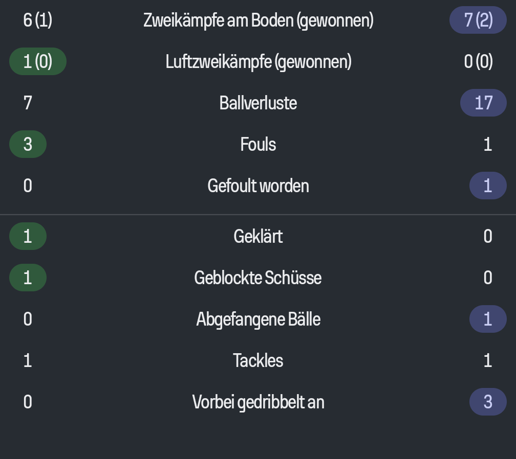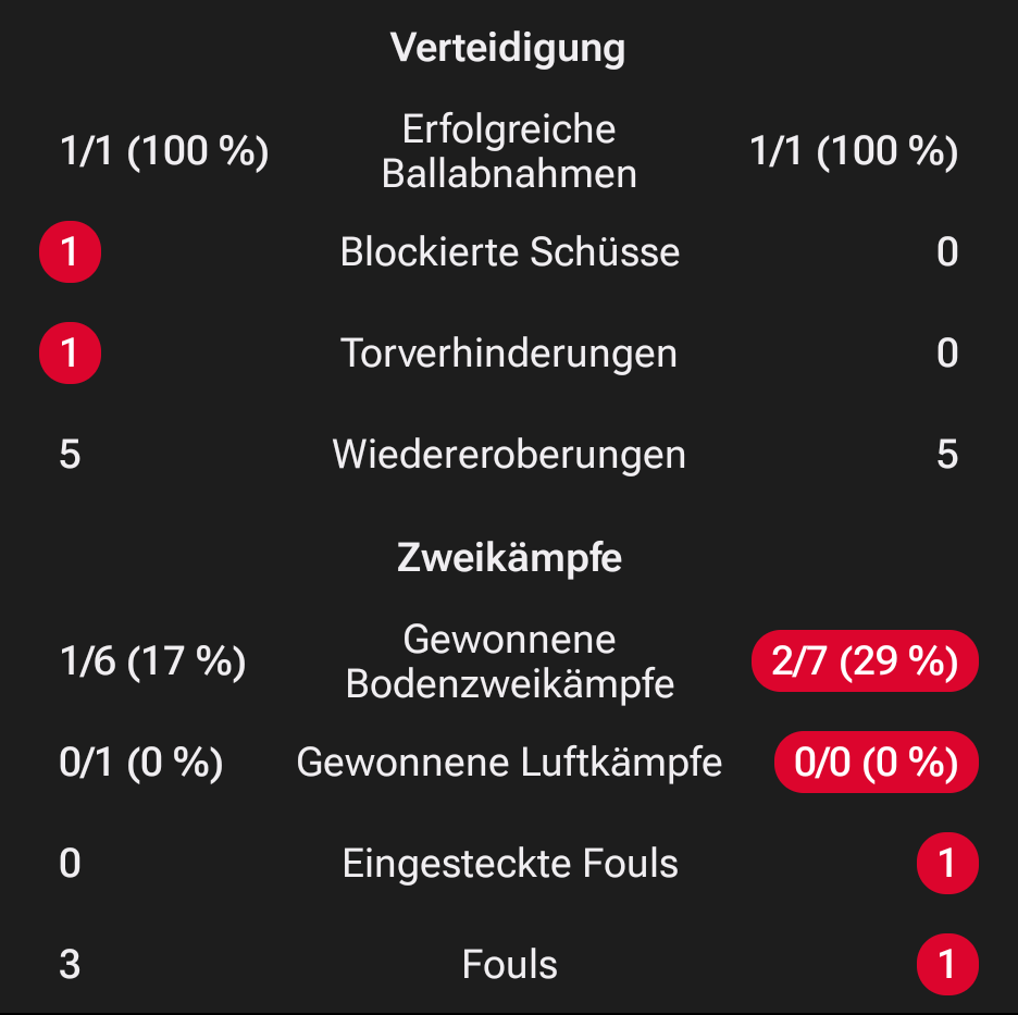Hier sieht man die defensiven Statistiken von Pavlovic beim Spiel gegen Hamburg (links) im Vergleich zu Kimmich (rechts). (Ist natürlich nur eine Partie, aber zeigt meiner Meinung schon, wo Pavlovic noch Schwächen hat).