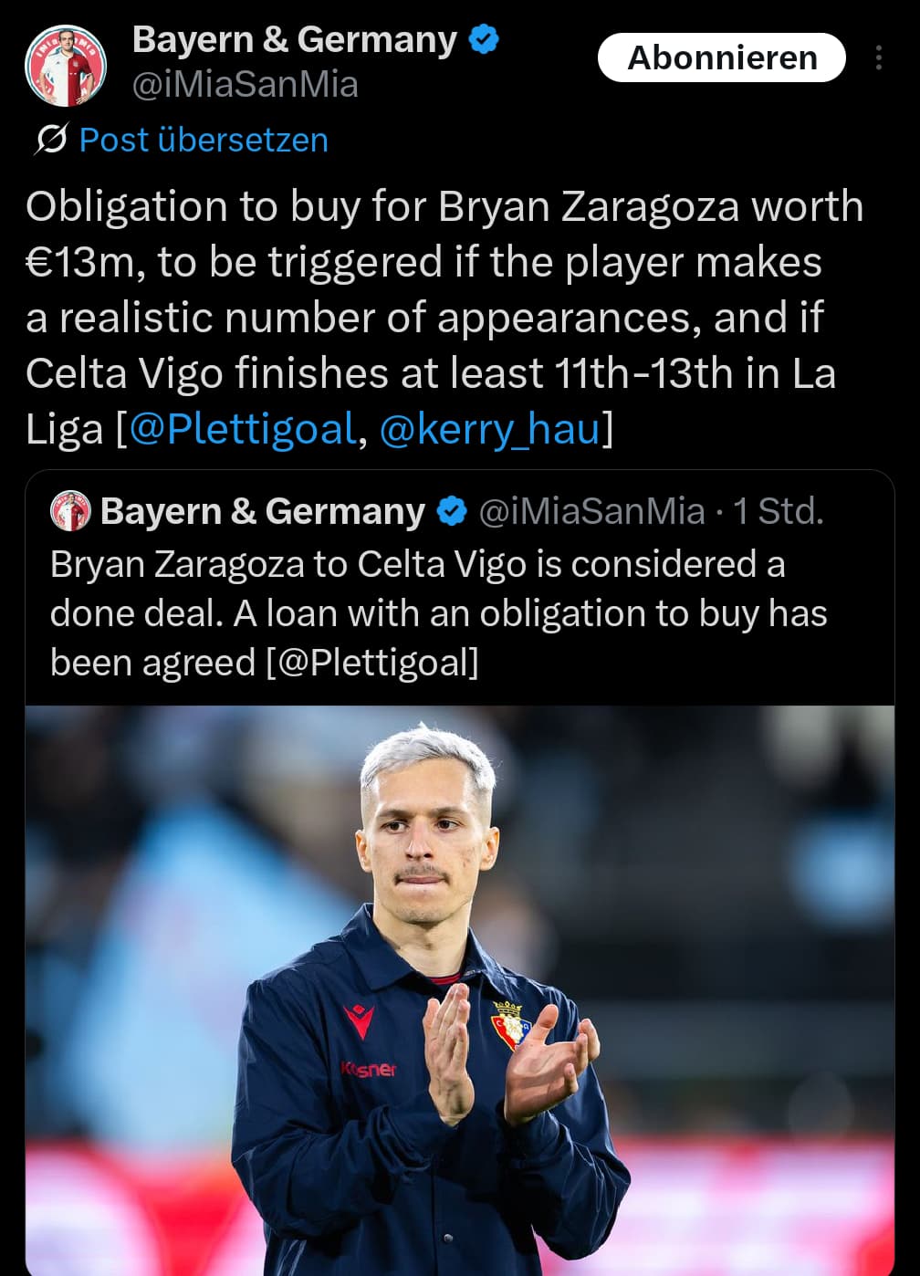 „Wie ‚Sky‘ berichtet, beinhaltet der Deal eine Kaufpflicht in Höhe von 13 Millionen Euro, die bei einer realistisch zu erreichenden Anzahl von Einsätzen greift. Darüber hinaus müsse der La Liga-Klub die kommende Spielzeit mindestens auf dem elften bis 13. Tabellenplatz beenden, damit besagter Passus aktiviert wird.“