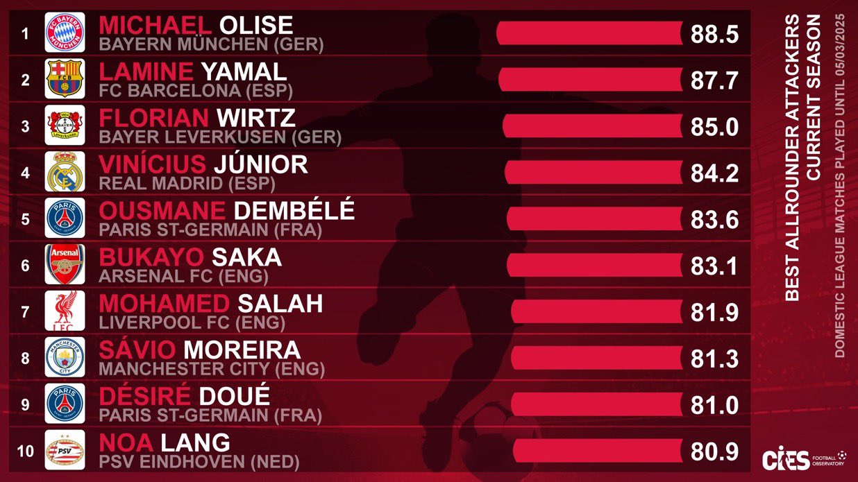 Michael Olise has been named the best-performing all-rounder attacking player in world football, according to the @CIES_Football study.