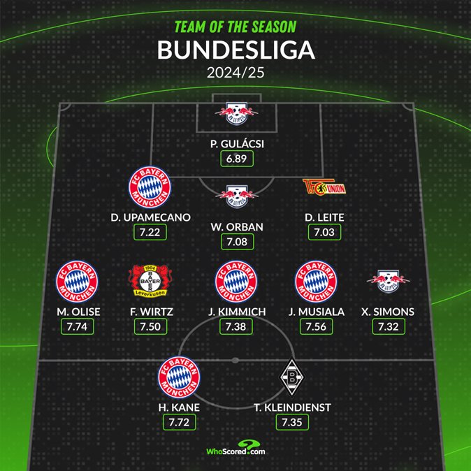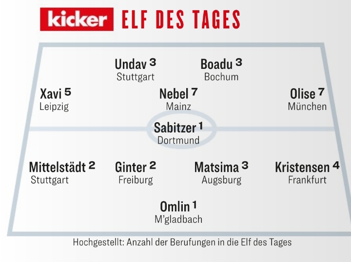Olise auch gemeinsam mit Paul Nebel am häufigsten im Kicker Team der Woche (hinter Marmoush und Kane) und damit auch Teil des Teams der der Saison.