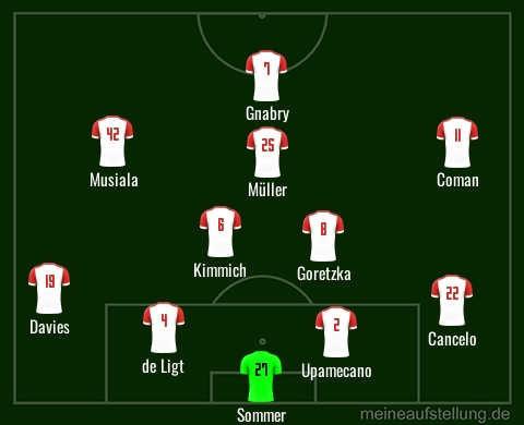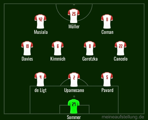 Im Grunde gibt es nur zwei Fragezeichen: Wer ersetzt Choupo im Sturmzentrum (Mané oder Müller) und bleibt Coman das Pendant zu Davies (wodurch Sané gute Chancen auf einen Einsatz hätte) oder rückt er eine Position vor und Cancelo wird für seinen starken Auftritt gegen Augsburg mit der Startelf belohnt.