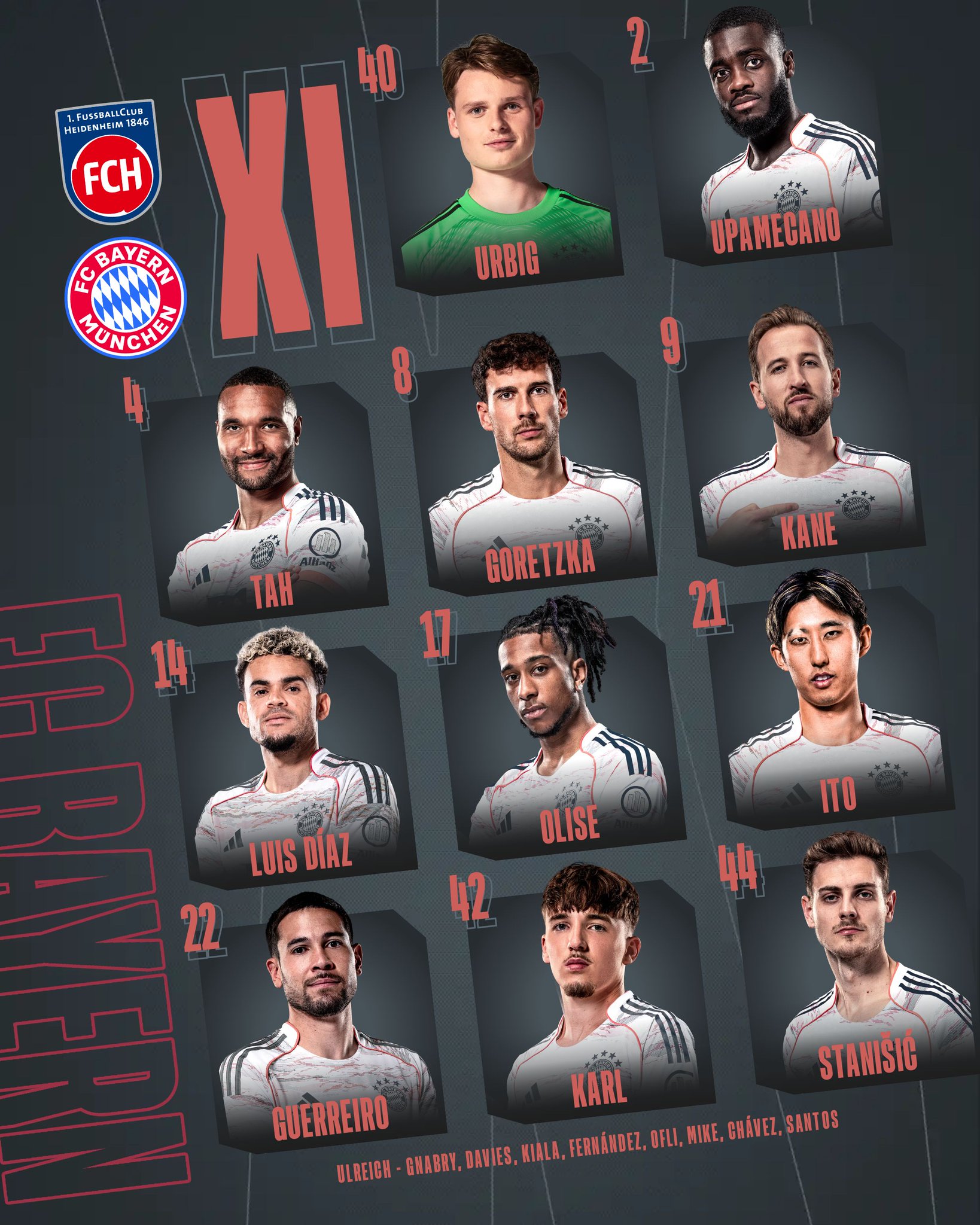 Vincent Kompany muss heute neben dem gelbgesperrten Konrad Laimer und dem verletzten Manuel Neuer (Muskelfaserriss) auf die erkrankten Aleksandar Pavlović, Tom Bischof und Sacha Boey verzichten. Minjae Kim fehlt zudem wegen Knieproblemen, Joshua Kimmich aufgrund von Sprunggelenksproblemen. Kimmich ist aber mit der Mannschaft angereist.