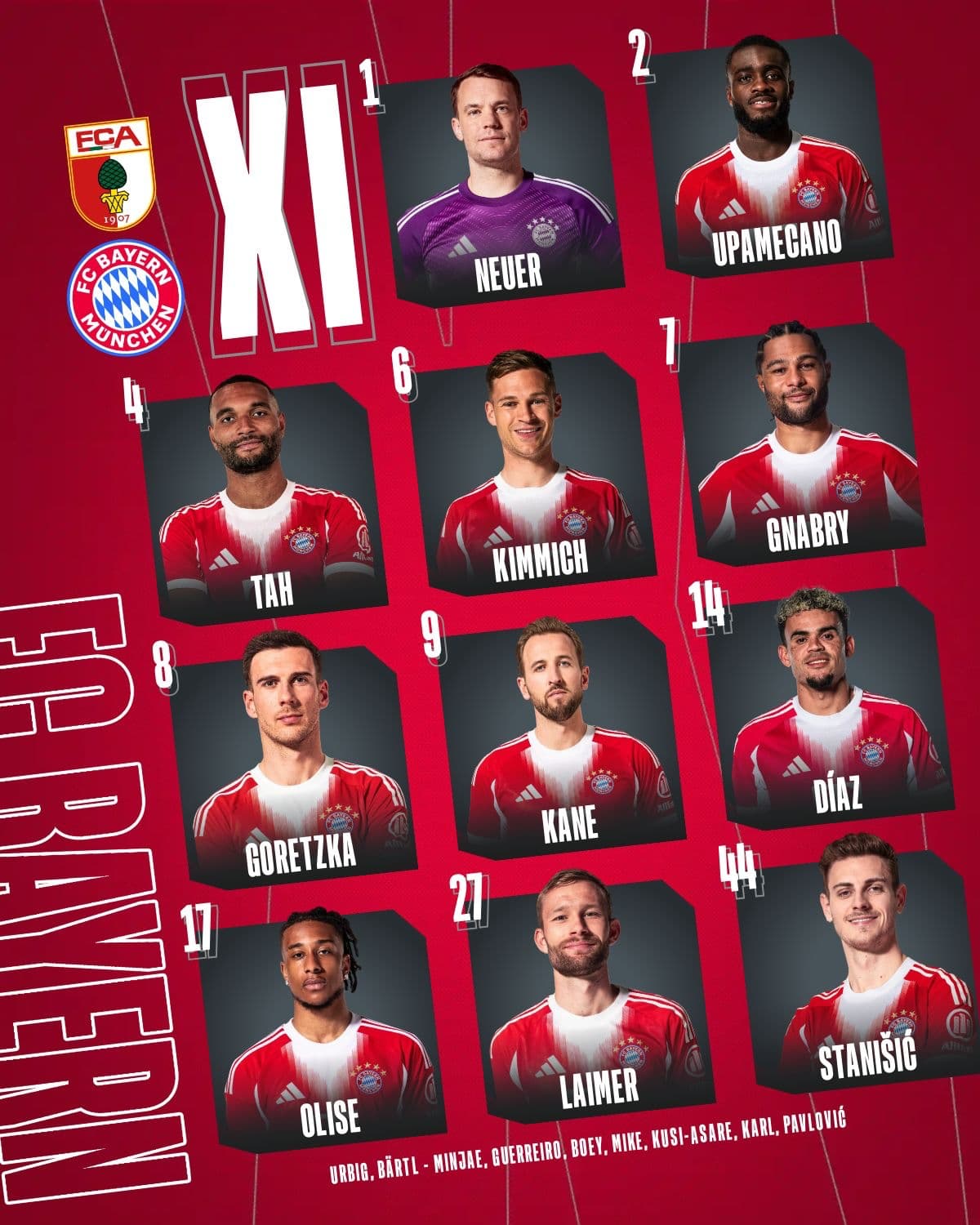 Weiterhin verletzt fehlen Phonzie (Reha nach Kreuzbandriß), der Blinddarm-Bischof, Musiala (Wadenbeinbruch), Ito (Reha nach Mittelfußbruch)
