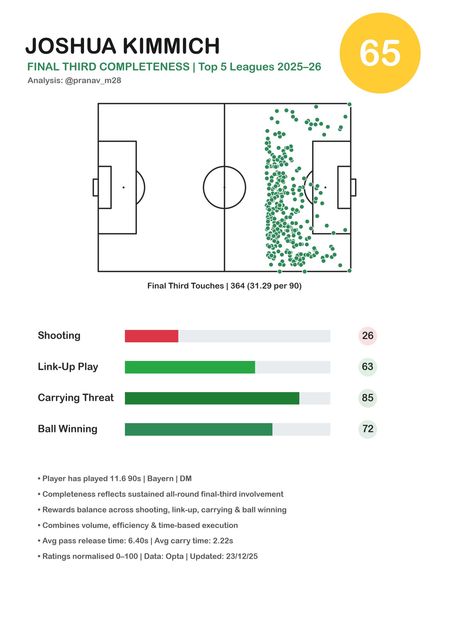 Es zeigt die Percentile für Kimmich für aktuelle und letzte Saison - in jeder der 4 Kategorien im finalen Drittel ist er zuletzt schwächer als in der Vorsaison.