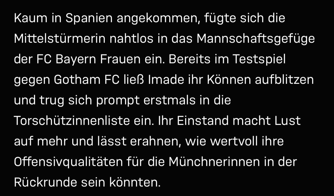 Sie wird wahrscheinlich aber nur solange in München bleiben bis Sie die nächsten Schgitte gemacht hat spätestens wenn Sie da angekommen ist wo Bühl aktuell ist wird Sie zurück nach Spielen gehen denke ich. Der FcB ist für Sie eine Station um sich weiter zu entwickeln du entwickeln durch Spielzeit die Sie in Spanien wegen der Leistungsdichte dort aktuell kicht bekommen könntr we7l es dort Vicky Lopez Kika und Co gibt