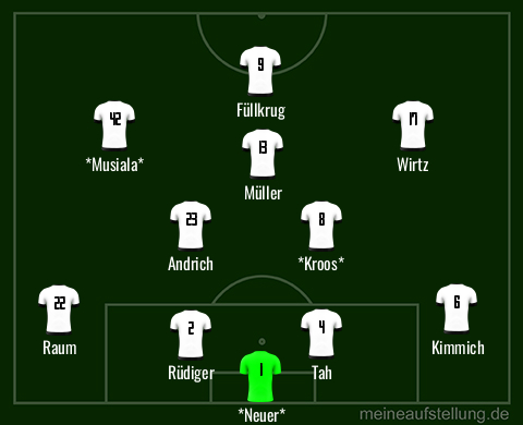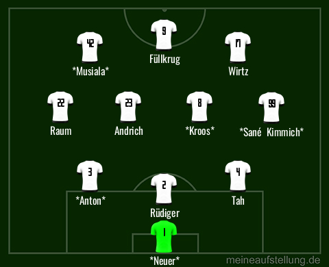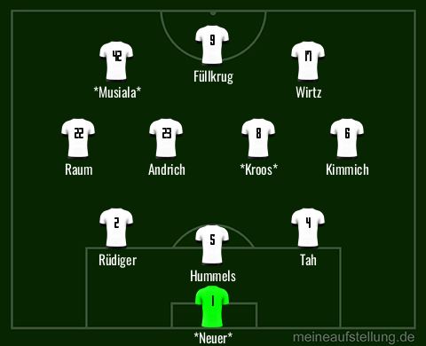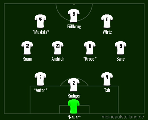 JN hat ja schon klar gesagt, dass er Leute dabei haben will, die sich aufopfern quasi. Denke, dass Andri h oder Groß hinter Kroos/Gündogan spielen werden. Doppel 10 mit Jamal und Wirtz. Offensive AV mit Kimmich und Raum/Gosens.