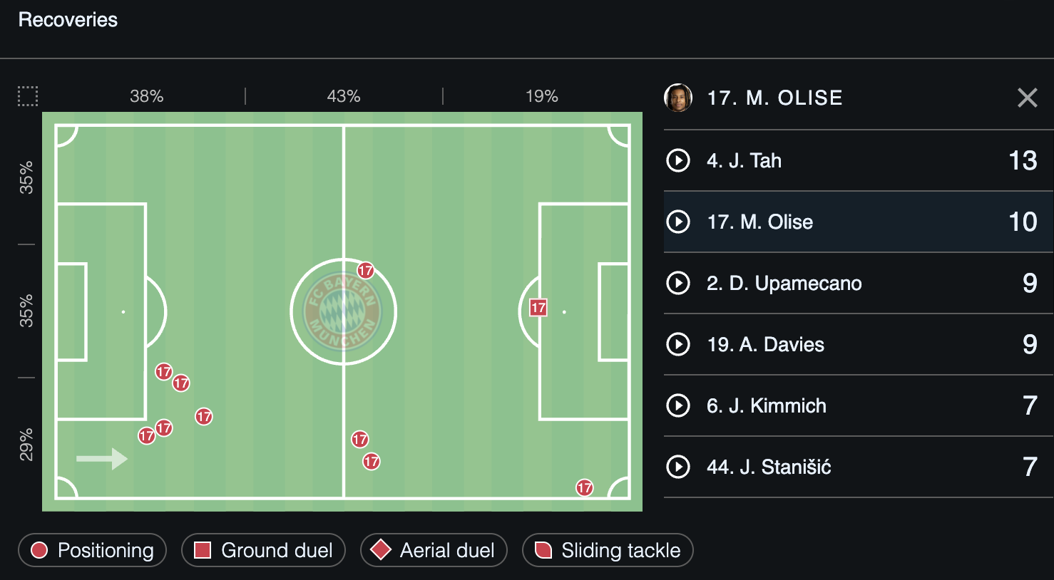 Kann sein, dass es vereinzelt mal ein paar Situationen gab, manchmal könnte er etwas aggressiver sein, aber ich finde, dass Olise hier schon sehr viel, sehr richtig macht. Gestern auch fünf Balleroberungen am eigenen Strafraum und die zweitmeisten im Spiel insgesamt. Ich traue mir persönlich auch zu, Situationen im Zweikampf gut einschätzen zu können. Ich denke, dass Stanisic in einigen Szenen, in denen er nicht im Stich gelassen wurde, nicht gut aussah. Der Fast-Elfmeter war zweikampftechnisch wirklich ganz schwach. So in einen Zweikampf zu gehen, mit dieser Körperhaltung … das hätte eigentlich aus Prinzip den Elfer verdient gehabt.