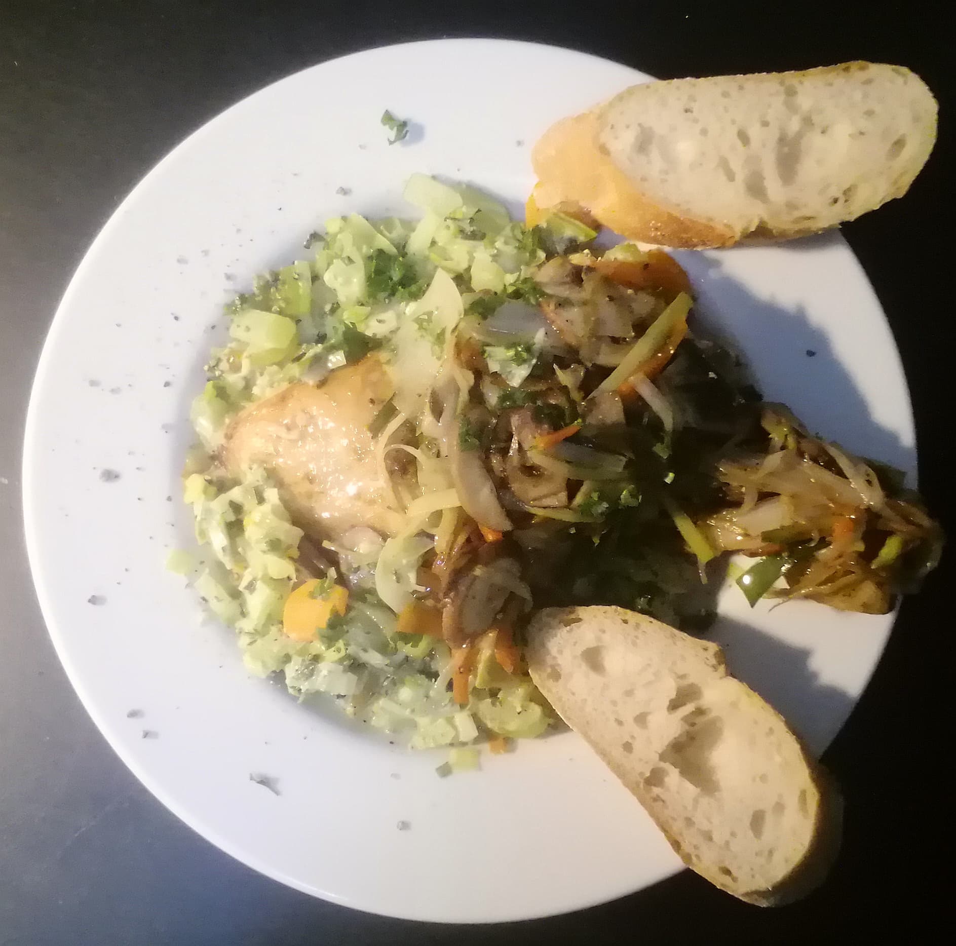 - pro Portion einen Hähnchenschenkel mittig auf einem tiefen Teller platzieren, oben drauf gebratenes Gemüse (Lauch, Karotten, Pilze) und außen herum Brühe mit Lauch, Karotten, Sellerie, Sahne und Knoblauch geben, mit dem Rest der Petersilie und etwas Pfeffer garnieren, das Baguettebrot dazu reichen.