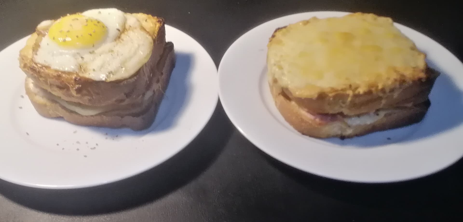 Zum Schluss beide Sandwiches aus dem Ofen holen, für die Madame-Version das Spiegelei oben drauf geben (mit etwas Pfeffer). Auch wenn man Sandwiches oft mit den Finger greift: der Einsatz von Messer und Gabel ist hier nicht unbedingt verkehrt ![]()