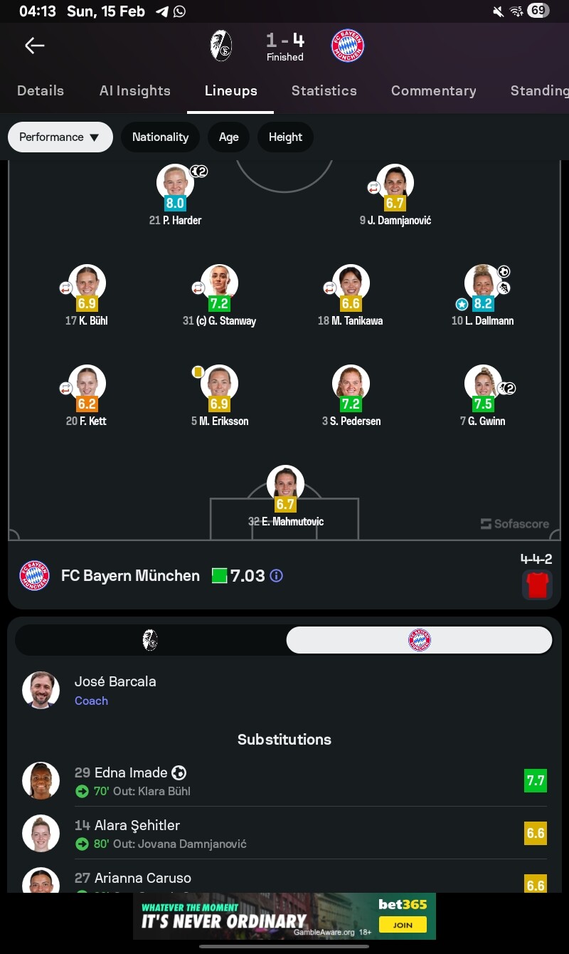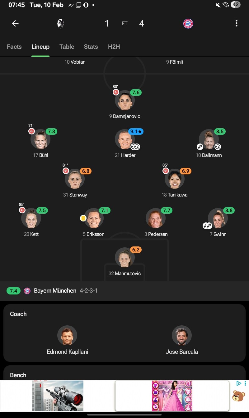 Diese automatisch generierten Player Ratings kamen von Fotmob (die übrigens auch öfter in MSR Artikeln als Quelle für diverse Statistiken erwähnt werden, also sicherlich Mal eine grundsätzlich seriöse Quelle) und zum Abgleich hier noch dasselbe von Sofascore (auch sehr angesehen in der MSR Kurve), die sonstige Hauptquelle für Player Ratings Whosored hat leider prompt überhaupt keine zum Frauenfußball: