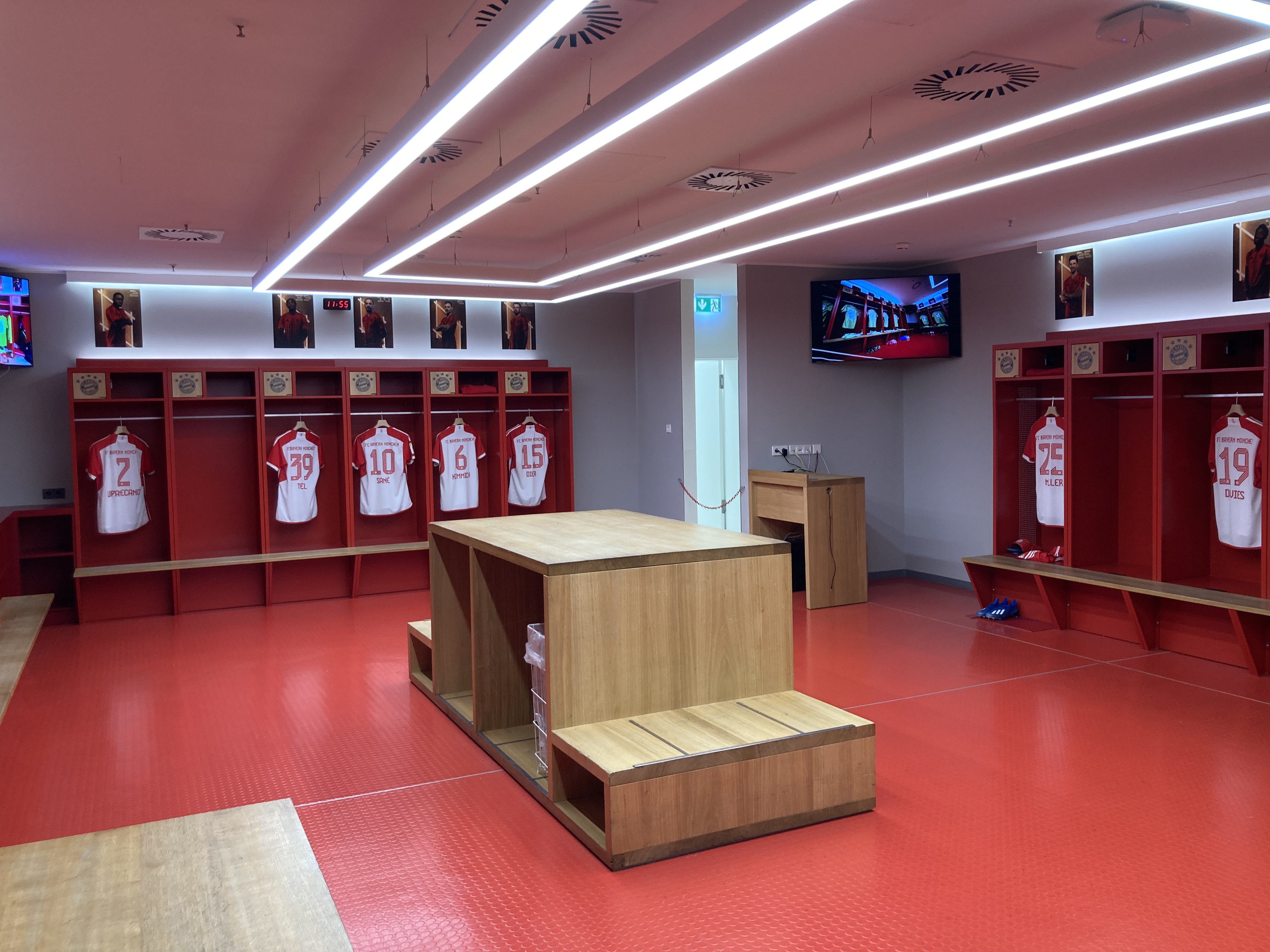 Wenn wir schon bei infrastrukturellen Gegebenheiten sind: Unser Amerikakorrespondent Marc, der mit seinem FC-Bayern-Fanclub schon häufiger die heiligen Hallen des FC Bayern mit seiner Präsenz beehren durfte, ist vom „Locker Room“* des FC Bayern auch nicht gerade angetan. Das sei kein Vergleich zu dem, was er aus dem US-Sport gewohnt ist und insgesamt eher peinlich für den FC Bayern. Wer sieht es diesen kahlen Wänden an, dass eine Königin hier wohnt?