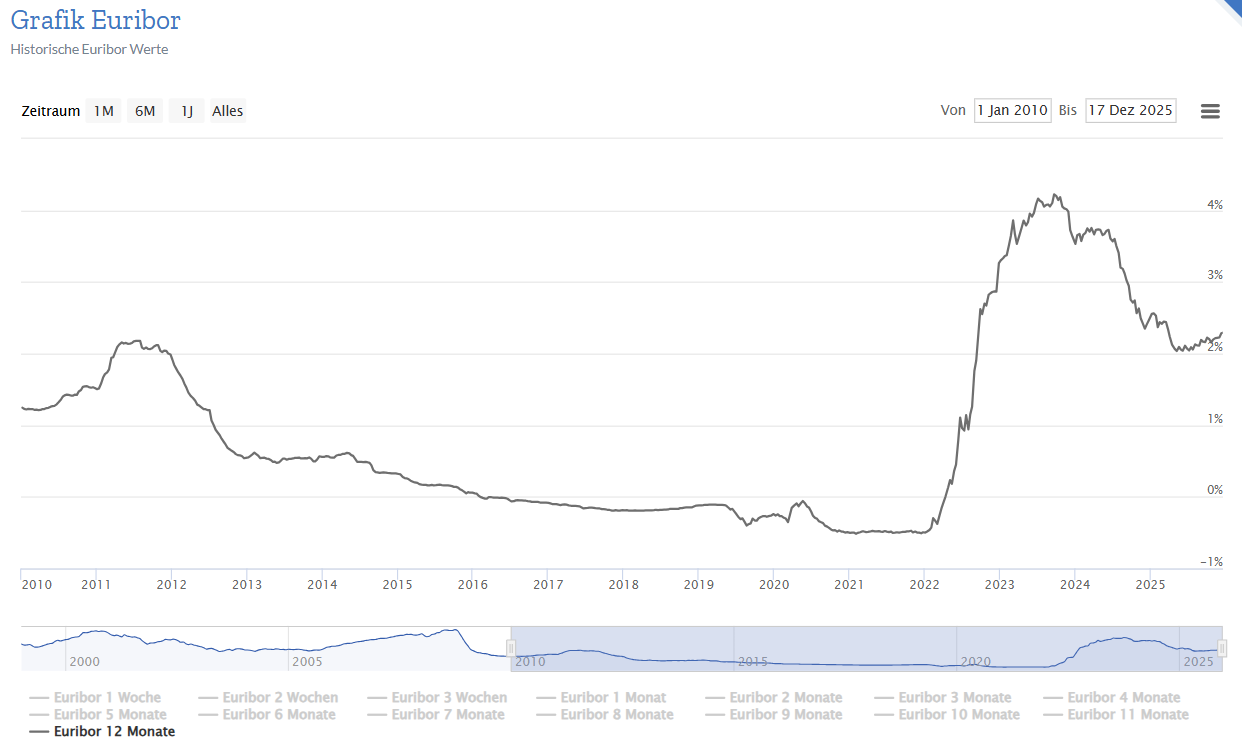 Für den FCB bietet sich eher ein Blick auf den Euribor oder ein einen Bauzinsen-Benchmark an. Und dort liegt das Zinsniveau weiterhin deutlich oberhalb der Niedrigzinsjahre 2014 bis 2021. (Es gibt naturgemäß eine Korrelation zum Leitzins.)