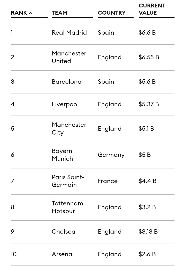 Laut dem Forbes-Magazin ist man der sechstwertvollste Klub der Welt