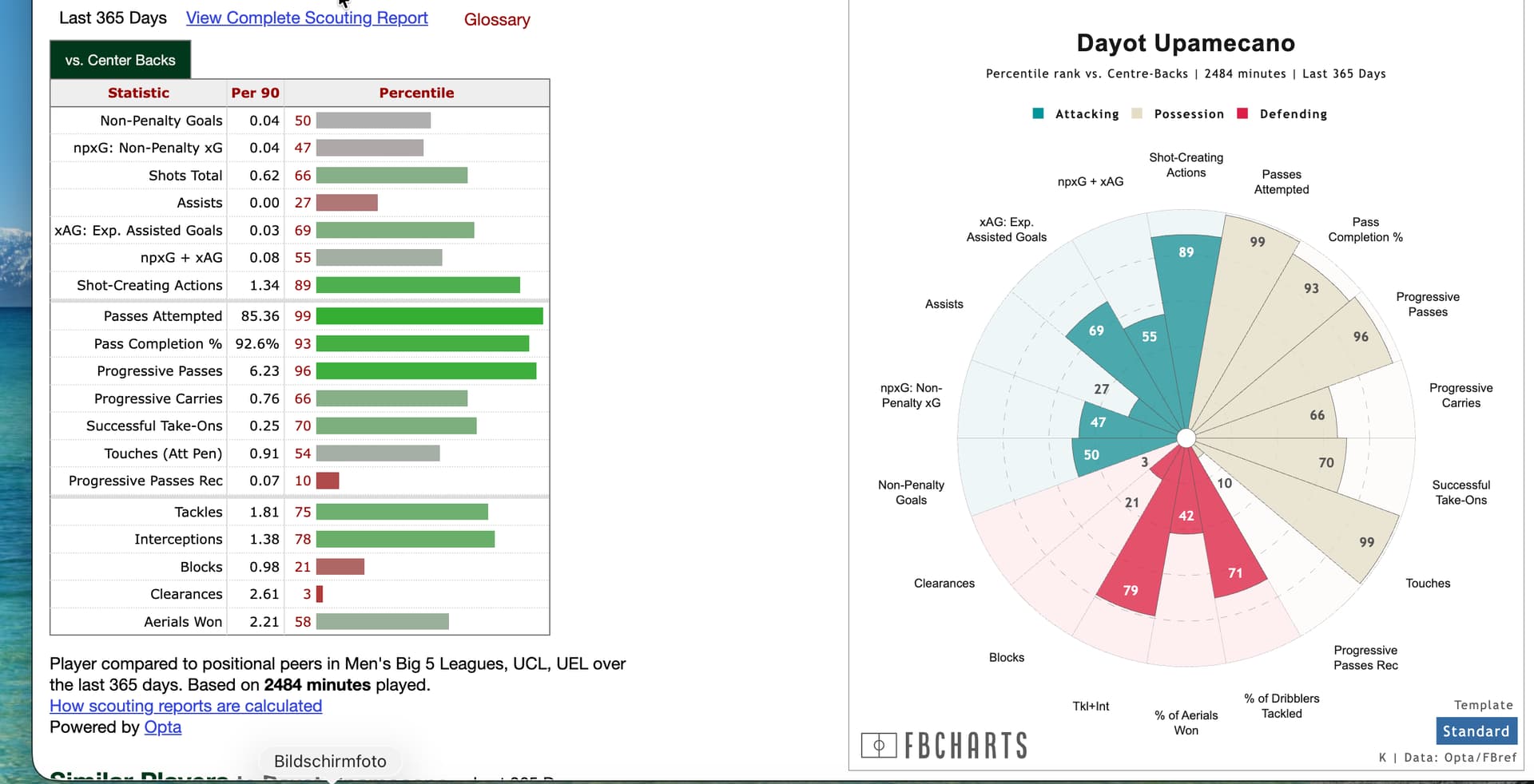 Konaté hat starke Aerials (84. Perzentil) und gute Carries (85.) aber er bringt deutlich weniger aktive Defensivaktionen mit (Tackles 41., Interceptions 24., Blocks 12.) – und vor allem viel geringeres Passvolumen und -präzision als Upamecano.