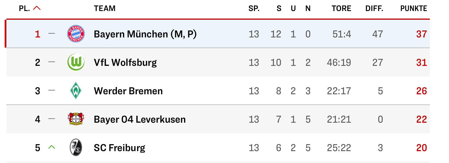 Bayern verlor letzte Saison 7 Punkte. Davor (in der Saison 23/24) waren es 6 Punkte und in der Saison 22/23 ebenfalls 7. Im Frauenfußball (in allen Top-Ligen) verlieren dominante Teams üblicherweise zwischen 5 und maximal 10 Punkten. Chelsea verlor letzte Saison 6 Punkte, Lyon 4.