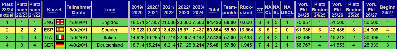 Bundesliga aktuell mit dem Punkte-Bestwert für die laufende Saison (8.214 vor Italien 8.142). Italien profitiert, was das gesamte standing betrifft, von der fetten letzten Saison und dem Losglück in der CL-Ko-Phase, wo man allen Schwergewichten bis ins Finale ausweichen konnte, mit drei Teams im VF, alle auf der gleichen Seite des Turnierbaums, und nur Benfica noch mit dabei -auf der anderen Seite City, Real, Bayern und Chelsea)