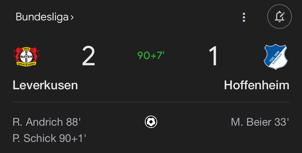 War aber (mal wieder) völlig verdient. Was Leverkusen abgezogen hat, ist einfach meisterreif. Mentalität AAA+++! Insofern schon mal Glückwunsch. Da brennt imho nichts mehr an. Eher verlieren die Bayern heute gegen die Bienen.