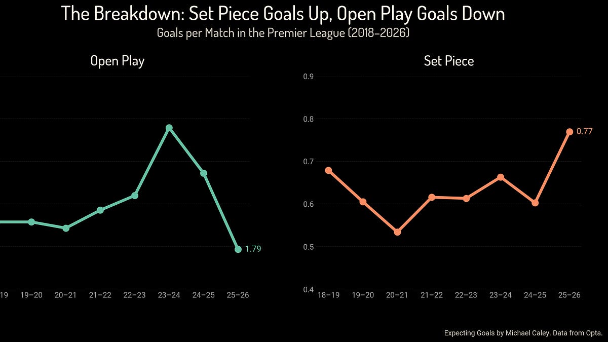 Der Artikel von Michael Caley beschreibt eine taktische Revolution in der Premier League, bei der Standards (wie Ecken, Einwürfe und Freistöße) einen immer größeren Anteil an den Toren ausmachen – insbesondere durch Ecken, Torhüter-Störungen und lange Einwürfe, was zu mehr Toren führt, als xG-Modelle vorhersagen. Diese Trends ersetzen zunehmend Offensivspiel-Tore und könnten sich auf Ligen wie die Bundesliga ausbreiten.