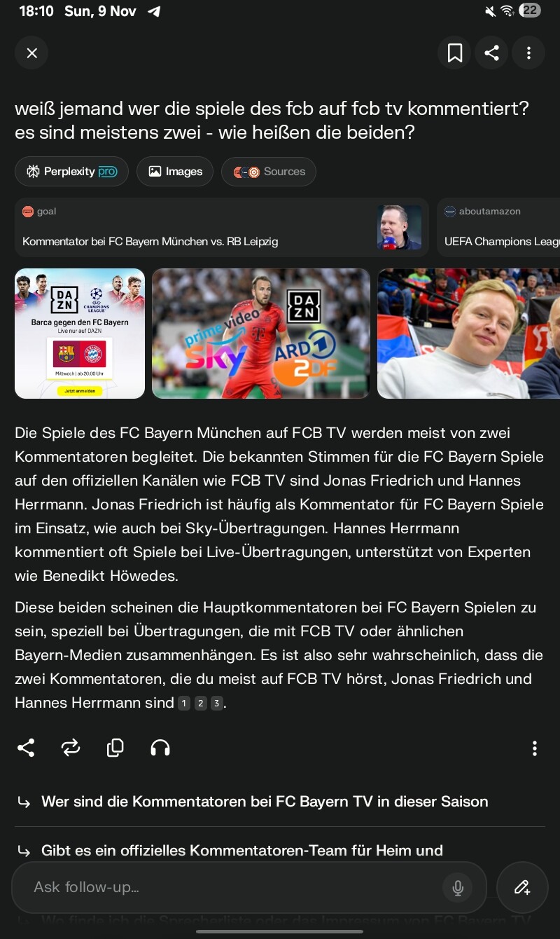 Der Grund hier ist wahrscheinlich, dass die KI „fcb TV“ nicht als eigenständigen Begriff erkennt sondern als „FCB“ und „TV“. Sie sucht also nach FCB, TV & Kommentatoren. Und das ist das häufigste Ergebnis. So würde ich mir das jedenfalls mit meinem begrenzten KI-Wissen erklären.