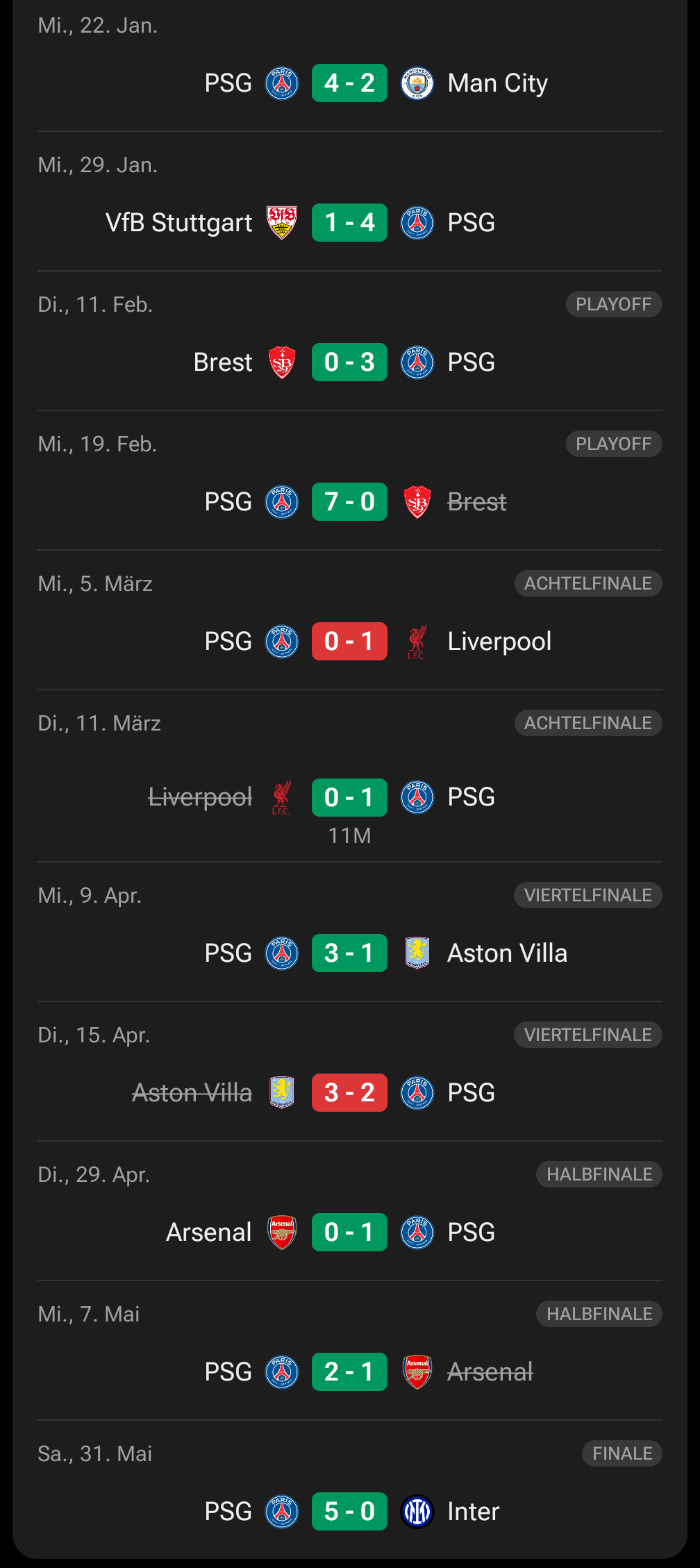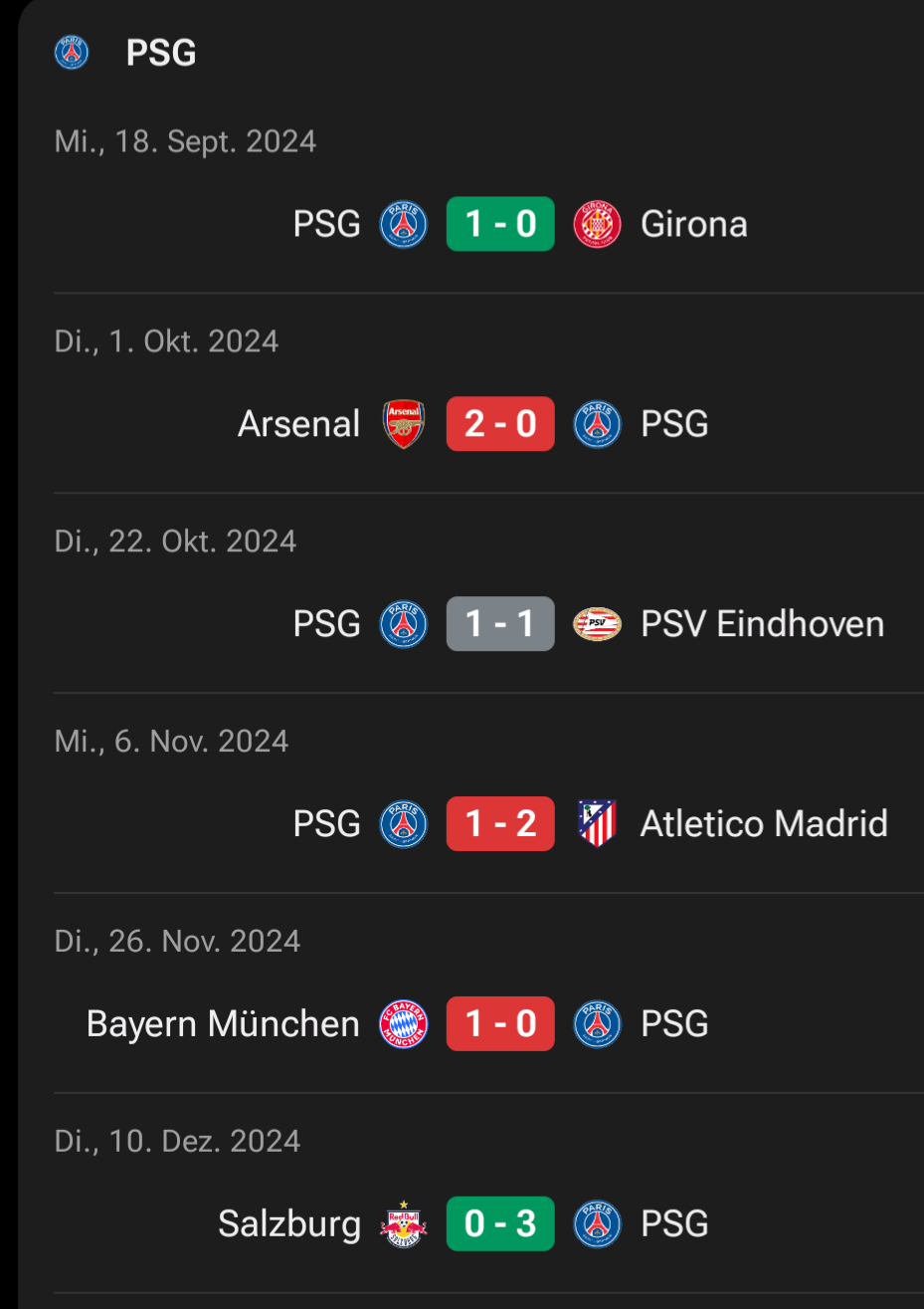 In 2024 hat Paris in der Champions League Ligaphase aus 6 Spielen nur zwei Spiele gewonnen und drei Spiele verloren sowie ein Spiele unentschieden gespielt. Dabei hat Paris eine Bilanz von 6-6 Toren, also ein Tor sowie Gegentor pro Spiel. Am Ende stand man auf Platz 25 der großen Tabelle. Da hat niemand Paris als Favoriten bezeichnet.